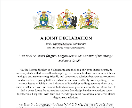 The King and the Rashtradhyaksh of Vishwamitra then issued a joint statement in regards to the degraded relations (which can be read here]).