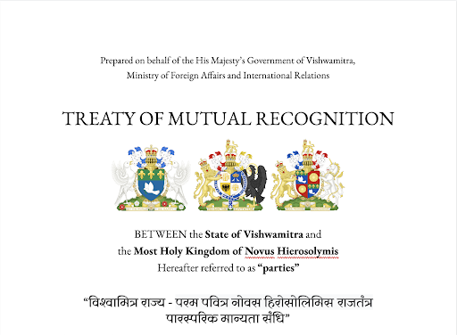 The treaty of mutual recognition signed on June 22, 2021 by His Majesty the Rashtradhyaksh of Vishwamitra, His Excellency the Most Honorable Prime Minister Gheorghe Ștefan Marius, and His Majesty the King.