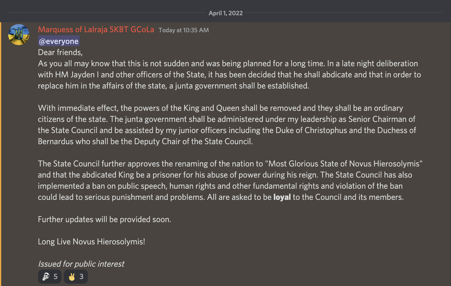 April 1 is Fools' Day, and Novohierosolymians weren't spared from the day's wrath. At 10:35AM local time (UTC+8), Lord Dhrubajyoti Roy, Marquess of Lalraja announced the abdication of His Majesty the King, Jayden the First. He also announced the formation of a junta government called the "State Council", led by him and his deputies, the Duke of Christophus and the Duchess of Bernardus, Lord Paolo vangelista and Lady Dana Abgelina respectively.